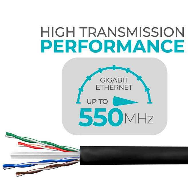 Our black bulk 1000 foot solid Cat6 Ethernet cable comes in an easy to use pull box and is ideal for the person looking to make longer permanent network runs during installation/expansion of network infrastructure. This wire is CM / inwall rated; it is not intended for plenum or riser situations.
