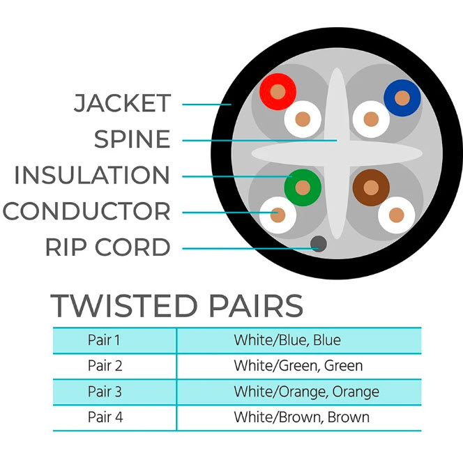 This particular cable is a black UTP (Unshielded Twisted Pair) solid cable. The individual conductors are 23 AWG (American wire gauge) solid pure copper. Pure copper conductors provide the best signal possible. Cat6 cable includes a spline to help ensure separation between the pairs which limits cross talk. Our Cat6 Ethernet cable exceeds the ANSI/TIA-568.2-D standard.