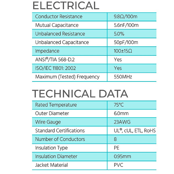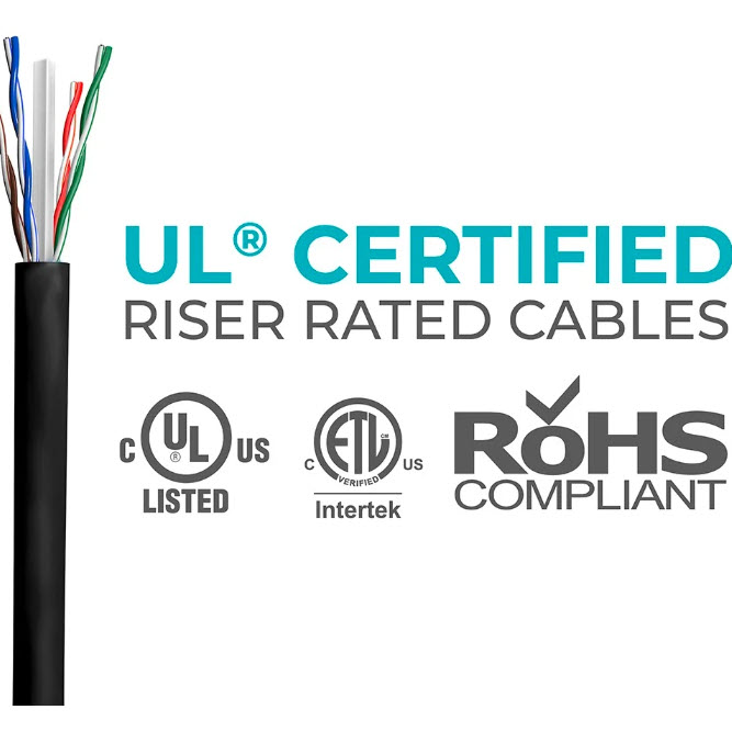 The jacket is in-wall rated (CM) meaning it complies with UL-1685. This network cable is solidly constructed, UL rated, ETL verified, and complies with RoHS, Power Over Ethernet(POE), & TAA.